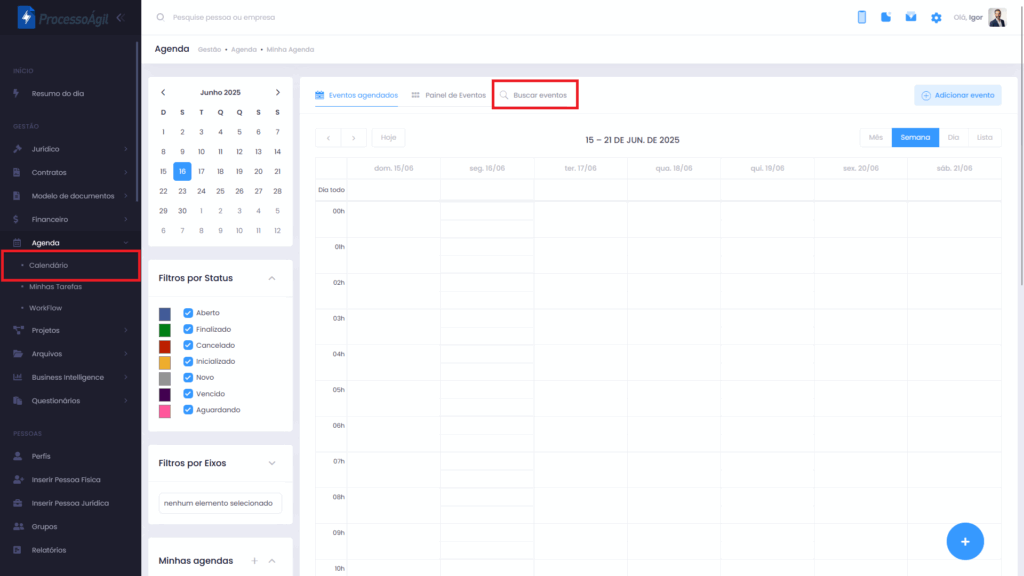 Entre no Calendário, dentro de Agenda, e selecione Buscar eventos.