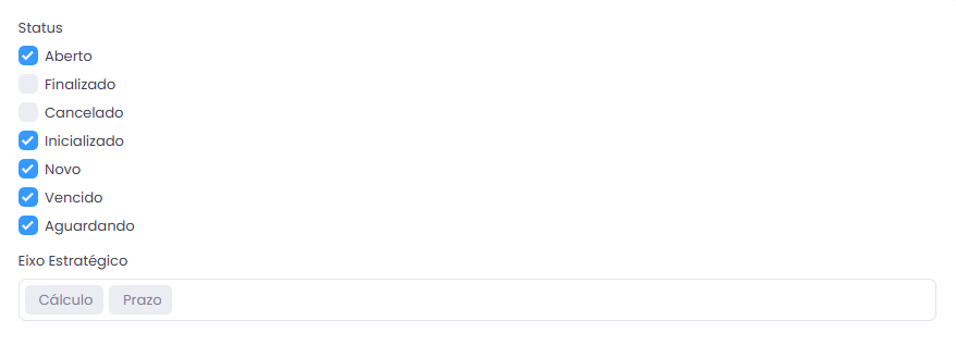 Além disso, na seção Status, é necessário deixar desmarcado os status Finalizado e Cancelado, fazendo com que estes status específicos não apareçam no relatório.