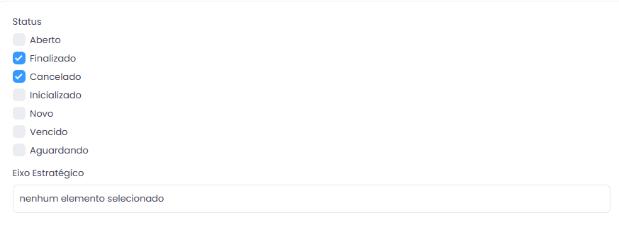 Essa é a aba da pesquisa de eventos, com diversos filtros diferentes para ajudar a aprimorar a pesquisa. Para pesquisar pelos processos finalizados, é necessário ir para a seção de Status. Nessa seção, deixe tudo desmarcado, a não ser por Finalizado ou Cancelado. Desse modo, o evento mostrará apenas os eventos com estes status.