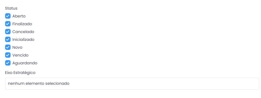 Esta é a aba de filtragem de eventos, e é possível filtrar de acordo com todos os campos. Para pesquisar por eixo estratégico, vá para a seção Status e clique em Eixo Estratégico. No pop-up que abrir, selecione todos os eixos desejados.