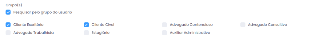 Esta tela tem diversos campos para filtro de usuários, e é possível fazer diversas pesquisas avançadas. Para filtrar apenas os perfis de clientes, vá para a seção Grupos, marque a caixa Pesquisar pelo grupo do usuário e selecione os grupos desejados, neste caso, apenas os clientes.