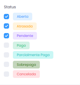 Depois disso, marque apenas os status Aberta, Atrasada, Pendente na seção Status, fazendo com que o relatório tenha apenas as receitas com este status.